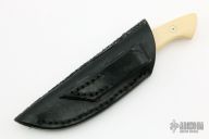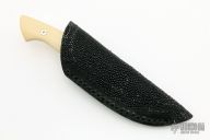 This knife by George Trout features a mirror polished blade with fileworked spine, .125" blade stock and .842" blade depth, full tapered tang construction. The handle has a nickel silver guard, ivory paper micarta scales with black liners and mosaic pins. Comes with a black leather sheath with stingray skin overlay. Has some scratches, otherwise good condition.