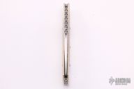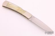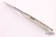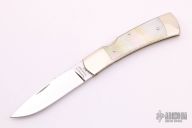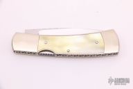 This Midlock folder by Harvey Otis McBurnette features a mirror polished drop point blade with a single nail nick and engraved blade spine. The handle has a nickel silver frame, gold lip pearl inlays and an engraved steel backspacer.  Nice blade seating and function. Hairline scratches are visible on the blade and frame otherwise the knife is in excellent condition.
