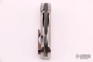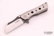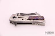 This Toucan by DaracSteel features a two-tone wharncliffe blade with dual thumbstuds and a checkered flipper. The handle has an orange peel finished titanium frame with matching backspacer and a tip up mokuti pocket clip. Rides on bearings, nice detent, lockup and blade seating. Comes with original box and COA dated July 5th, 2017. Excellent condition.