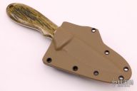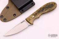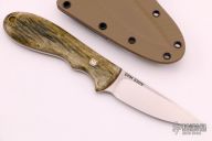 This Black Widow Caper by Dan Crotts features a satin finished blade, .137" blade stock and .839" blade depth, full tang construction. The handle has green jigged bone scales and a single mosaic pin. Comes with a kydex sheath with a belt loop for horizontal carry. New from maker.