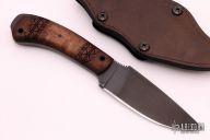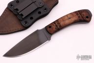 This knife is dedicated to the ‘woodcraft’ lifestyle. The overall balance of handle to blade encourages the user to get into the cut, with the thumb ramp adding extra power to heavy cutting. The WK Woodsman has an extended skeletonized tang that is useful for light hammering. Knife Specifications Blade steel: 80CrV2 Black oxide no-glare finish Blade length: 4 1/4" Overall length: 8 3/4" Blade thickness: 3/16" Skeletonized full tang Thumb index file work Sheath Lined Kydex® with leather cover Designed for multiple carry options (See our Info page for carry options) New from maker with original box and papers.
