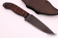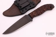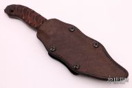 A custom Kydex-lined black leather sheath comes with this knife and compliments the all-black fixed blade. The sheath allows for multiple carry positions and fixtures. A feature of the sheath is that the knife can be drawn with little to no noise. The sheath combines the best of leather and Kydex into a truly functional rig.
