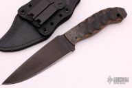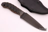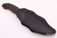 A custom Kydex-lined black leather sheath comes with this knife and compliments the all-black fixed blade. The sheath allows for multiple carry positions and fixtures. A feature of the sheath is that the knife can be drawn with little to no noise. The sheath combines the best of leather and Kydex into a truly functional rig.