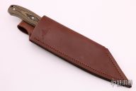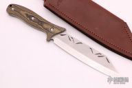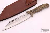 This Custom Seax Fixed Blade by Ernie Emerson features hand ground by hand satin finished blade with stonewashed flats and notched thumbrest, .136" blade stock and 1.438" blade depth, full tang construction. The handle has black/brown richlite scales. Comes with a brown leather sheath. Brand new from maker at the 2021 Blade Show. 1 of 3