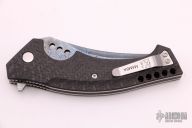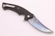 This Mamba flipper by Walter Brend is a Joel Pirela design, it features a Blued Damascus blade with notched blade spine and spine of handle. Carbon Fiber scales, titanium liners, carbon fiber backspacer, and a tip up titanium clip. Smooth function with a nice lock, detent and blade seating dead center. Hidden lanyard pin at the butt. Excellent condition.  Dated 06/14 on the clip.