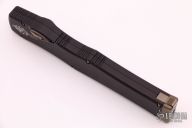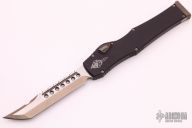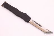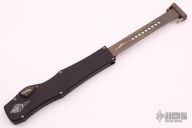 This Halo VI features a bronzed Hellhound tanto blade with satin flats, fullers and notched spine. Its handle is made from black Mil-Spec anodized alloy with bronzed hardware. The charging handle comes marked with the Microtech logo and date of creation along with the serial number. Microtech's Halo VI sets itself apart from previous models with added safety features and an improved charging handle mechanism. The firing button has been upgraded with an integrated safety to prevent accidental deployment. Its upgraded charging handle is built with dual pivoting latches that create a secure seal in the closed position. Comes with original box and papers. Dated 09/2018 and S/N 061. Excellent condition.