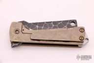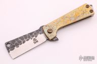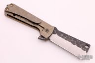 This Baby Fat Bastard by RichMade Knives features a tumbled cleaver style blade with rock pattern flats and a flipper. The handle has a brass adn anodized and textured titanium frame with a matching tip up clip. Great blade seating, detent and lock up, rides on bearings. Includes a zippered case and COA dated May 2019. Excellent condition.