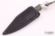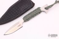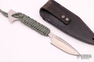 This Harpoon by Jerry Hossom  features a hand rub satin finished blade with sharpened top edge, full tang construction with grey paracord wrap, .160" blade thickness and .999" blade depth. Comes with a hand tooled black leather sheath. Includes a zippered case. Excellent condition.