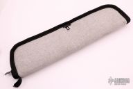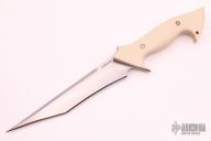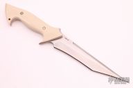 This Revenge by Jerry Hossom features nicely shaped ivory paper micarta scales with red liners and mosaic pins. Hand rubbed satin finished tanto recurve blade with a sharpened top edge, .152" blade stock and 1.558" blade depth, full tang construction. Fits nicely in hand. Includes a zippered case. Excellent condition.