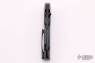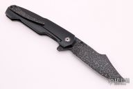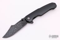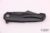 This Boudicca by Anton van der Westhuizen features a Blackened Bertie Rietveld "Nebula" Damascus blade with a single thumbstud and a flipper. The handle has a black cerakote finished titanium frame with matching Damascus pivot collars, backspacer and tip up clip. Rides on ceramic IKBS, nice detent, lockup and blade seating. Has concealed overtravel stop. Comes with a zippered case and COA. Excellent condition. Has "Boudicca Coin" from AD30 engraved on the pivot screws.