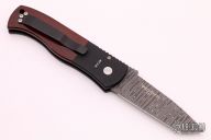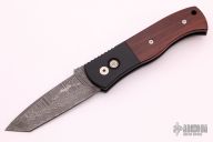 This CQC7 Auto by Pro-Tech knives is an Emerson design, it has a Norris stainless "Ladder" Damascus blade, chisel ground tanto, notched thumbrest. The handle has a black aluminum frame with cocobolo scales, mosaic pin push button, tip up black stainless steel clip. #37 of 45. Comes with original box, sheath and papers. Excellent condition.