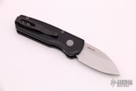 The Runt 5 by Pro-Tech Knives features a tumbled sheepsfoot style blade. The handle features a smooth black aluminum handle with a black tip up stainless steel pocket clip. New from maker!