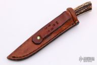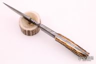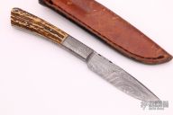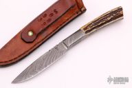 This Integral Hunter by Steve Brooks features a drop point Damascus blade with a fileworked thumbrest, .180" blade stock and .861" blade depth, full integral tapered tang construction. The integrally constructed handle features dovetailed Damascus bolsters and stag scales with steel pins and lanyard tube. Includes a brown leather sheath with belt loop. Excellent condition. #9839H