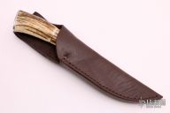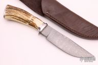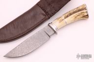 This Hunter by Dennis Riley features a Damascus blade with .263" blade thickness and 1.513" blade depth, hidden tang construction. The handle has stainless steel guard and butt, two-piece stag grip with stainless pins and stainless spacer. Comes with a brown leather sheath with belt loop. Excellent condition.