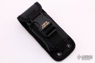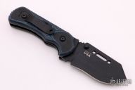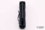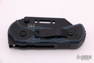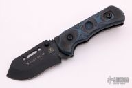 This Xcest Delta from TOPS Knives features a black traction coated recurved clip point blade with swedge, dual thumb studs and notched thumbrest. The handle is comprised black and blue G10 scales with Bow Drill Divot over black traction coated aluminum frame. The matching stainless steel tip up clip is reversible for left or right hand carry. Includes MOLLE compatible nylon sheath. Excellent condition.