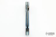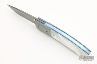 This custom liner lock folder by Bill Ankrom features a Damascus blade with single gold thumbstud with diamond inlay. The handle has Damascus bolsters, mother of pearl scales, anodized titanium liners and backspacer. Nice function, strong lock up and nice detent and blade seating. Includes a padded zippered case. Has a few light scratches and a couple light oxidation spots on the blade, otherwise good condition.