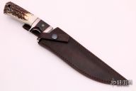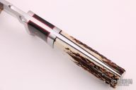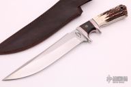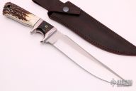 This Fighter from Ricardo Perpina features a satin finish clip point style blade with a sharpened top edge and a tapered tang.  .207" Blade Stock.  1.499" Blade Depth.  The handle features stainless steel guards complemented by a stag and micarta grip.  Red liners. Includes a brown leather sheath.  New from Maker.
