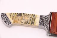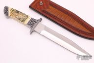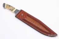 This SealTac Presentation Fighter by Jim Hammond features a double edged high polished blade with satin flats, .235" blade stock and 1.434" blade depth, full tapered tang construction. The handle has engraved stainless steel bolsters, creamy mammoth ivory scales with scrimshaw marked "MC 83". Comes with a hand tooled brown leather sheath by Paul Long, it is not actually for this knife, it is a little longer than the blade, but it looks great with the knife. Numbered "1of1" on the blade. Excellent fit and finish. The Has a couple cracks in the scales around the pins, otherwise excellent condition. Comes with a zippered case.