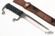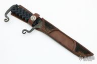 This knife by Theo Rock Nazz features a tanto blade that has been differentially hardened with clay, has visible hamon line. Forged from a 50+ year old file, .246" blade stock and 1.144" blade depth, full tang construction. The handle has been forged into an integral guard and butt with scroll and a 3D printed high density polymer handle. Comes with a brown leather sheath with hair inlays. Comes with a zippered case. Excellent condition.