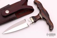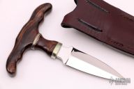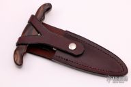 This Push Dagger by Larry C. Mensch features a mirror finished double-edged blade with .238" blade stock and 1.162" blade depth, hidden tang construction. The handle has a cocobolo grip with nickel silver spacers and guard. Comes with a brown leather sheath and a zippered case. Excellent condition.