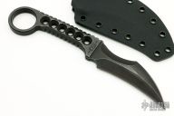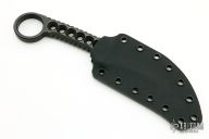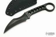 This Custom Floro Fighting Systems Spectre by ZU Bladeworxs features a black hawkbill blade with sharpened top edge, .255" blade stock and 1.086" blade depth, integral construction with notched tang and hole pattern in handle, ring at the butt. Comes with a kydex sheath. Has some sheath wear, otherwise excellent condition.