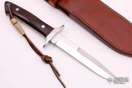 This Fighter by Tim Hartman features a mirror polished blade with false top edge, .185" blade stock and .978" blade depth, full tapered tang construction. The handle has mirror polished stainless steel guard, ironwood burl scales with stainless steel pins and a lanyard hole. Comes with a brown leather sheath. Has a few light scratches, otherwise excellent condition.