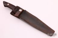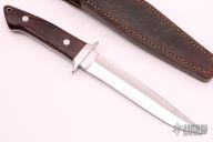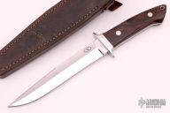 This Loveless Style Fighter from Richard A. Rotella features a mirror polished clip point blade with sharpened top edge, .202" blade stock and 1.125" blade depth, full tapered tang construction. The handle is comprised of a stainless steel guard and ironwood scales over red liners. Lanyard tube in pommel. Includes leather sheath with belt loop. Excellent condition.
