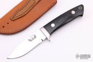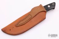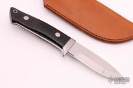 This Dropped Hunter by Zac Buchanan features a mirror polished drop point blade with .167" blade stock and 1.044" blade depth, full tapered tang construction. The handle has a satin finished stainless steel guard, black canvas micarta scales with thin red spacers/liners, lanyard hole. Comes with a brown leather sheath. Excellent condition.