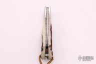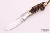 This midlock by Scott Sawby and Steven Mullin features a satin finished drop point blade. The handle features steel bolsters, stag scales and a steel file worked frame. Includes a brown leather sheath. Has a very light stain near the tip of the blade (very hard to even see) otherwise the knife is in excellent condition.