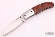This liner lock by Ronald Cotton Hewitt features a hand rubbed satin finished blade with single thumbstud. The handle has stainless steel dovetailed bolsters, wood scales, titanium liners, fileworked stainless steel backspacer. Has a couple light scratches, otherwise excellent condition.