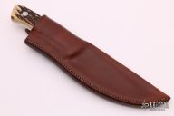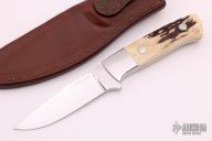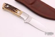 This knife by R. Drennan features a hand rub satin finished blade, .190" blade stock and 1.064" blade depth, full tapered tang construction. The handle has stainless steel bolsters and stag scales. Comes with a nylon zippered case and brown leather sheath. Excellent condition.