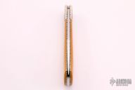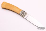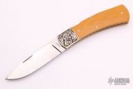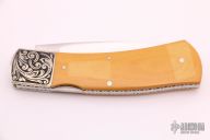 This lockback by Harvey Otis McBurnette features a mirror polished blade with nail nick. The handle has engraved and dovetailed nickel silver bolsters, yellow paper micarta covers, fileworked nickel silver liners, stainless backspacer. Nice lockup, function and blade seating. Has a small ding on the bolster, otherwise excellent condition.