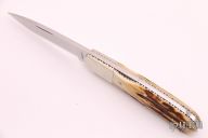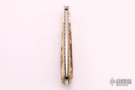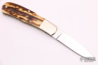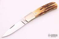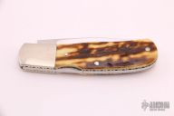This lockback by Harvey Otis McBurnette features a mirror polished blade with nail nick. The handle has dovetailed nickel silver bolsters, stag covers, fileworked nickel silver liners, stainless backspacer. Nice lockup, function and blade seating. Has a few light scratches, otherwise excellent condition.