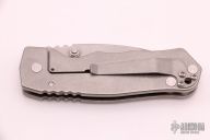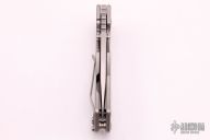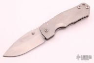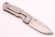 This DUA framelock folder from Grayman Knives features a spear point recurve bead tumbled blade with dual thumb-studs and notched thumb-rest. The handle has a tumbled titanium frame, and tip up titanium clip. Great blade seating, detent and lock up. Excellent condition.