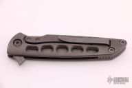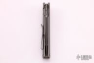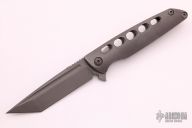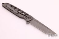 This Typhoon Framelock Flipper from Brian Nadeau / Sharp by Design has a dark tumble finished, tanto shaped blade with notched thumb rest and swedge. Handle is milled 6AL-4V titanium, stainless steel tip up clip, stainless steel lock bar insert, and milled titanium backspacer. Flips wonderfully. Excellent lockup and detent, with dead center blade seating. Beautiful piece. Excellent condition. Comes with original box.