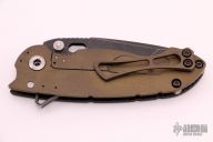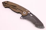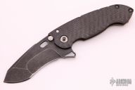 This Solo Flipper by Direware features a dark tumble finished blade with notched thumbrest and a flipper. The handle has a carbon fiber and anodized and blasted titanium frame and tip up clip, titanium pivot and barrel spacers. Comes with original box. Rides on bearings, nice detent, lockup and blade seating. New from maker.