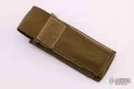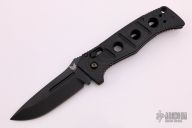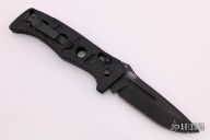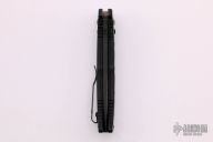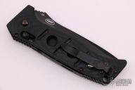 This Siebert designed 2750BKS Adamas Auto Axis Lock has a black coated D2 stainless steel drop point blade with blood grooves and notched thumb rest. Handle is black G10 over black stainless steel liners, tan G10 spacer, reversible tip up black stainless steel clip, and spine safety button. Includes tan nylon sheath. Has a scuff on the clip, otherwise excellent condition.