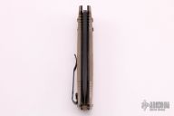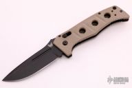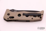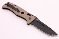 This Siebert designed 2750BKS Adamas Auto Axis Lock has a black coated D2 stainless steel drop point blade with blood grooves and notched thumb rest. Handle is tan G10 over black stainless steel liners, tan G10 spacer, reversible tip up black stainless steel clip, and spine safety button.  Includes tan nylon sheath. Excellent condition.