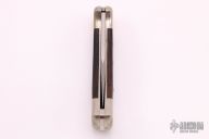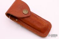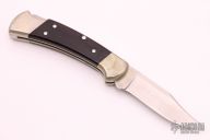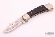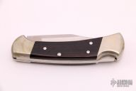 This 25th Anniversary Buck model 112 has a satin finished blade, nickel silver frame and wood inlays. Comes with brown leather sheath. Has some patina on the frame, otherwise excellent condition.
