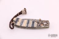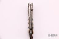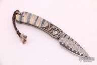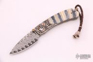 This B09 Osage by William Henry is #08 of 25. It features a Wave pattern ZDP-189 core San Mai Damascus blade with single thumbstud with a spessartite set in an 18kt gold bezel. The handle has a sterling silver frame that has been hand carved, spessartite set in 18kt gold bezel in push button, mammoth tooth inlays, sterling silver lanyard bail with leather lanyard and silver beads. Comes with a black leather pocket sheath with clip, original box and papers. Excellent condition.