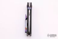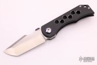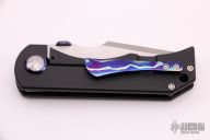 This Framelock Folder by Robert Carter features a satin finished tanto style blade with swedge, knurled and Robtanium thumbdisc. The handle has a black titanium frame over titanium barrel spacers, Robtanium pivot collars and tip up clip. Excellent condition. Comes with a zippered case.