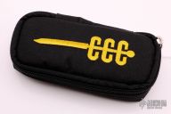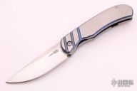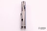 This Hornet from Clyde Challenor features a satin finished blade with notched thumbrest and front flipper. The handle has a two-tone anodized titanium frame with a matching tip up clip. Has a ceramic detent ball, and caged bearings. Comes with a nylon zippered case and COA dated 6-30-15. Excellent condition.