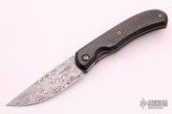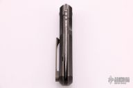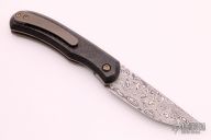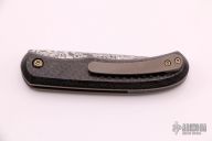 This Hornet MK2 from Clyde Challenor features a Damasteel blade with notched thumbrest and front flipper. The handle has carbon fiber bolsters, lightning strike carbon fiber scales, bead blasted titanium liners and tip up clip, carbon fiber backspacer. Has a ceramic detent ball, and caged bearings. Comes with a nylon zippered case and COA dated 9-26-16. Excellent condition.