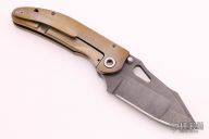 This Saurus from Damjan Knives features a clip point acid tumble finished compound ground blade with swedge and thumbhole. The handle has an anodized and bark textured titanium frame and backspacer with matching tip up clip. Great blade seating, detent and lock up. Comes with a COA dated 11-3-16. Excellent condition.