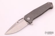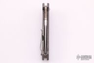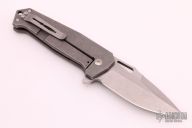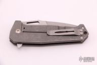 This Hitman from Jim Burke features a tumble finished blade with swedge and notched thumb ramp. The handle is comprised of a tumbled titanium frame over barrel spacers. Titanium tip up pocket clip. Comes with anodized titanium lanyard bead. Excellent condition. Rides on bearings, nice lockup and blade seating. Comes with COA.