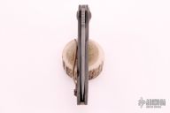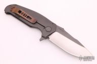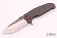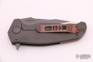 This Little Whiskey by Bill Coye features a satin finished blade with tumbled flats, swedge, notched thumbrest and flipper. The handle has a tumbled titanium frame with an anodized titanium backspacer and tip up clip, has a Bakelite pivot collar. Includes a COA dated April 16, 2015. Excellent condition.