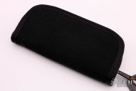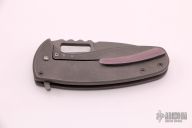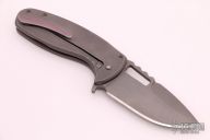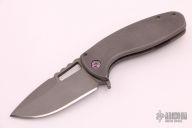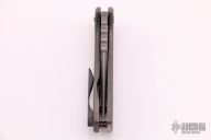 This Vendetta by Ferrum Forge and Compliance Edge features a bead blasted blade with notched thumbrest, thumbhole and flipper. The handle has a tumbled titanium frame with anodized titanium pivot and tip up clip with hidden screws. Rides on bearings, nice detent, lockup and blade seating. Comes with zippered case. Excellent condition.
