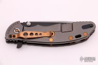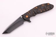 This Custom XM-24 framelock flipper by Rick Hinderer features a hellfire ground blade with a DLC finished blade with a satin finished blade spine. The handle has a lightening strike carbon fiber and tumble finish titanium frame with a copper tip down reversible pocket clip. Nice detent, lockup and blade seating. Includes a padded zippered case. Excellent condition. We believe this knife was reground by a third party, according to Rick Hinderer.