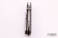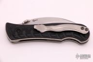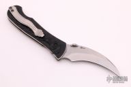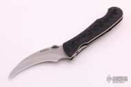 This Elvia Folder by Korth Cutlery features a stonewashed hawkbill blade with thumbdisc. The handle has black G-10 scales and backspacer, orange peel finished titanium liners and a tip up titanium clip. Comes with a velcro case. Rides on IKBS, nice detent, lockup and blade seating. Excellent condition.