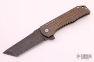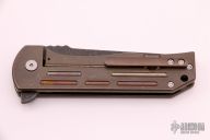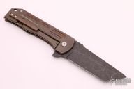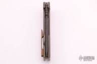 This MidTech F-16 flipper from Robert Carter features a dark tumble finished tanto blade with swedge, notched thumbrest and flipper. The handle has an anodized and tumble finished titanium with frame with custom milled tip up clip. Comes with original bent titanium clip. Blade is centered when closed, strong detent, and locks open with no movement/play. Rides on cages bearings. Comes with original box and invoice for the custom titanium clip. Excellent condition.